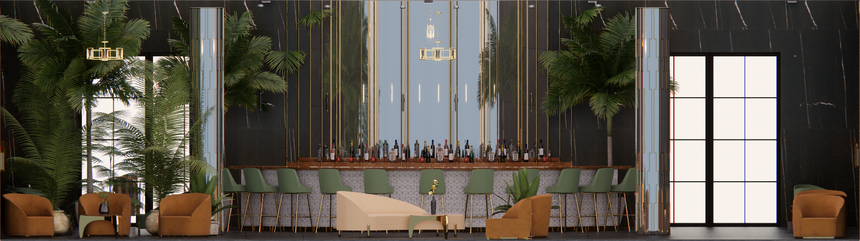 The interior rooftop lounge is based off of the rich jazz and metropolitan history in the City of Chicago. While the textiles are modern, the custom bar lends into the rich Art Deco inspired architecture.